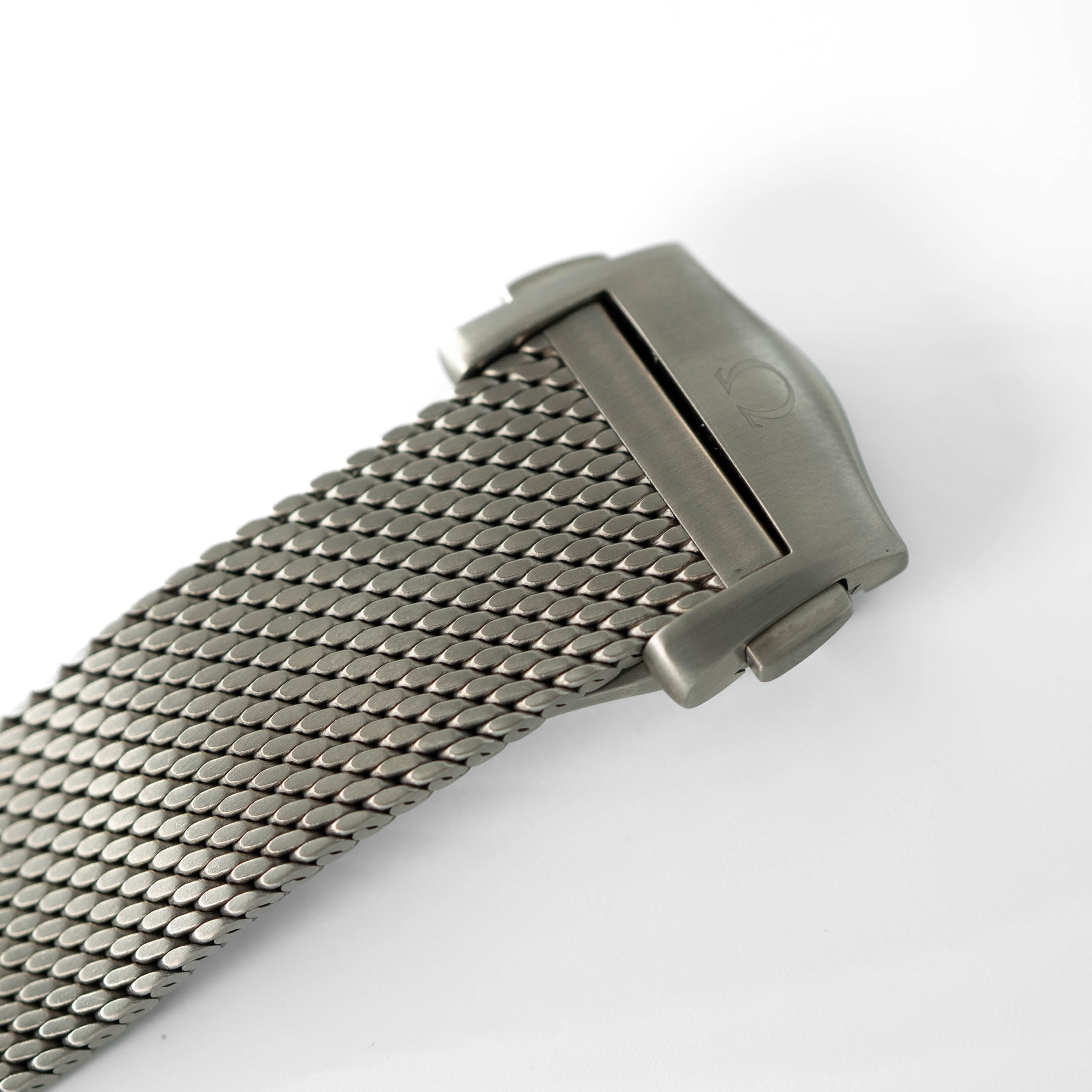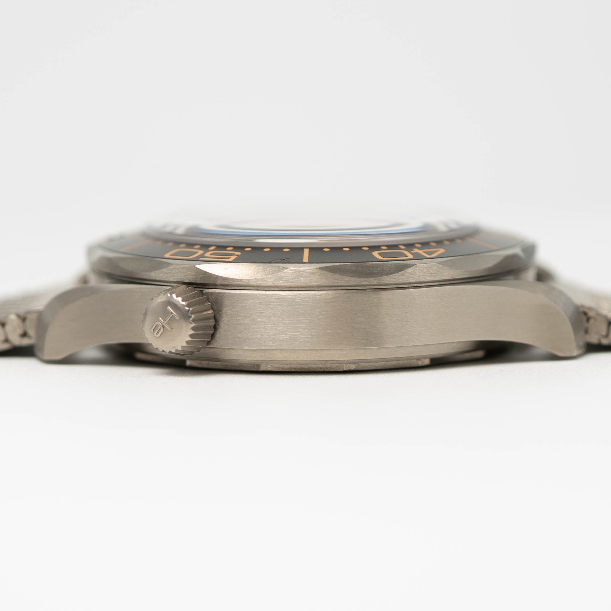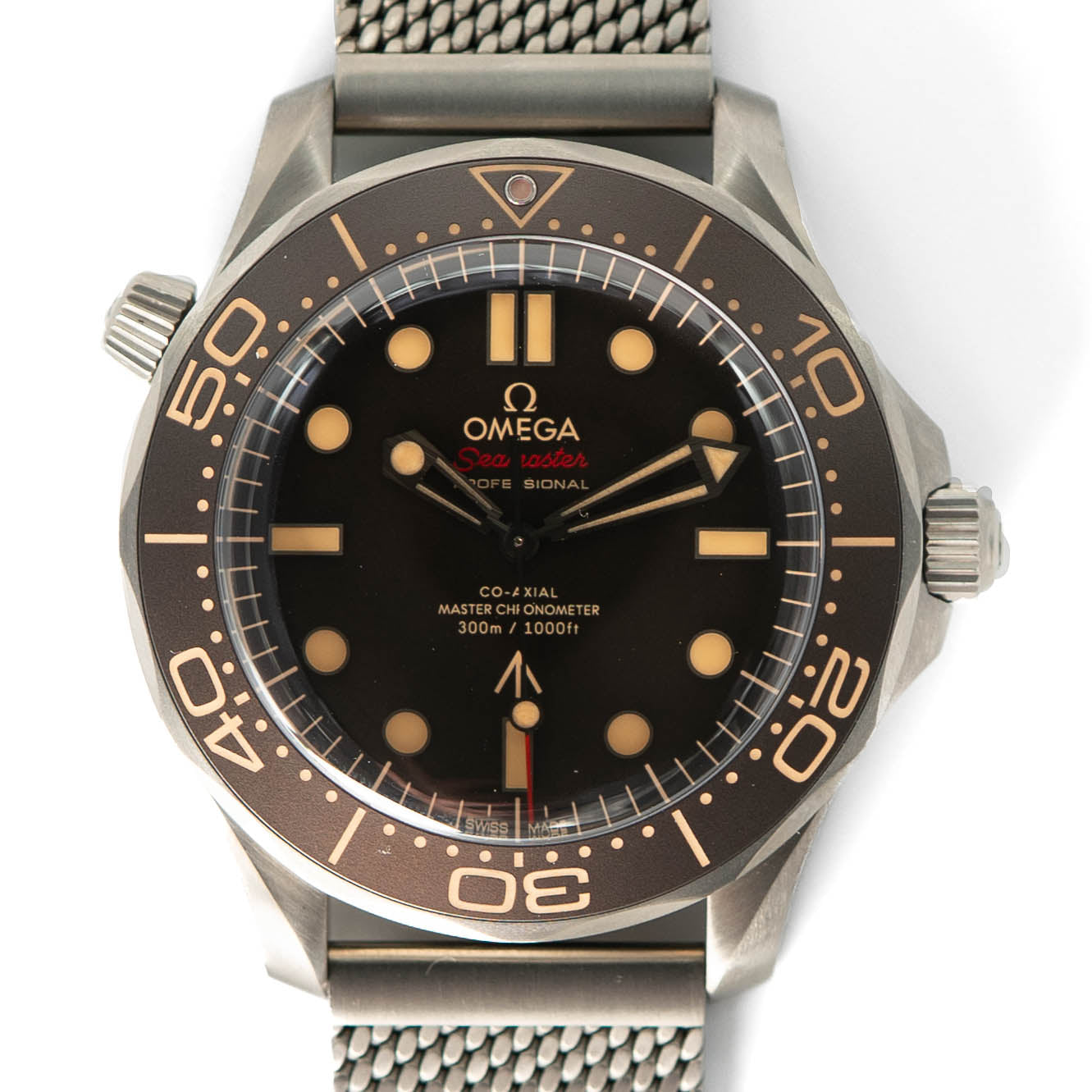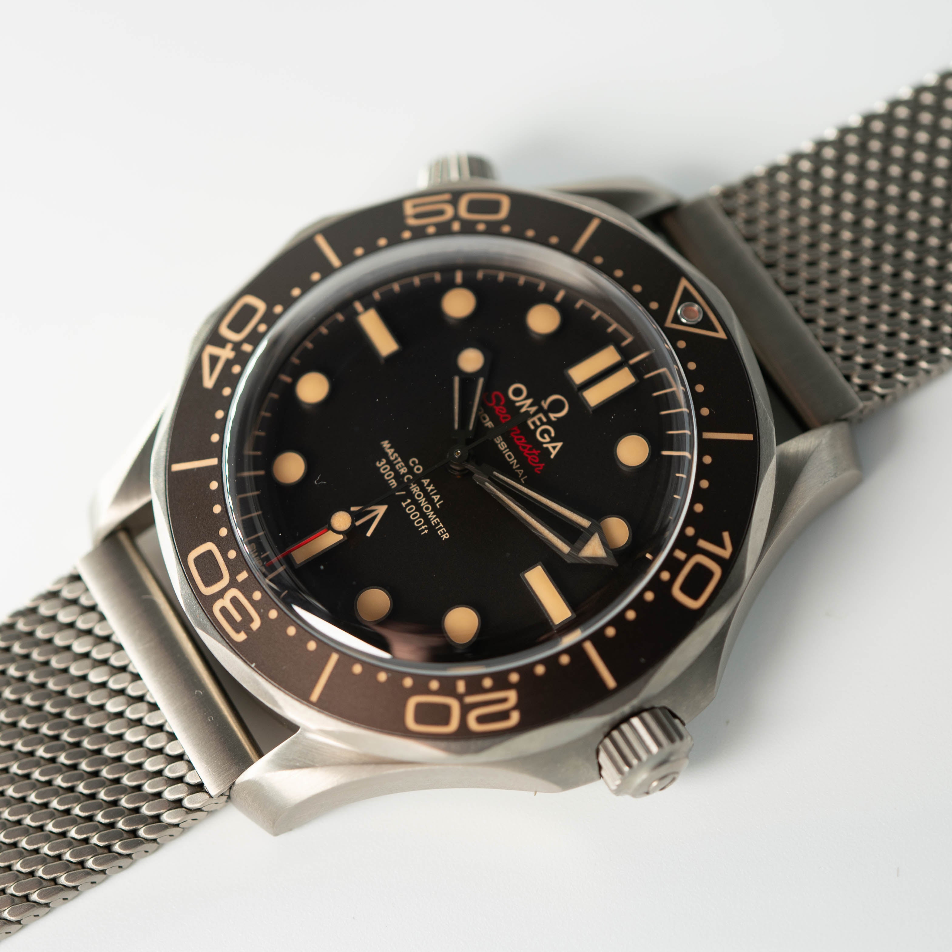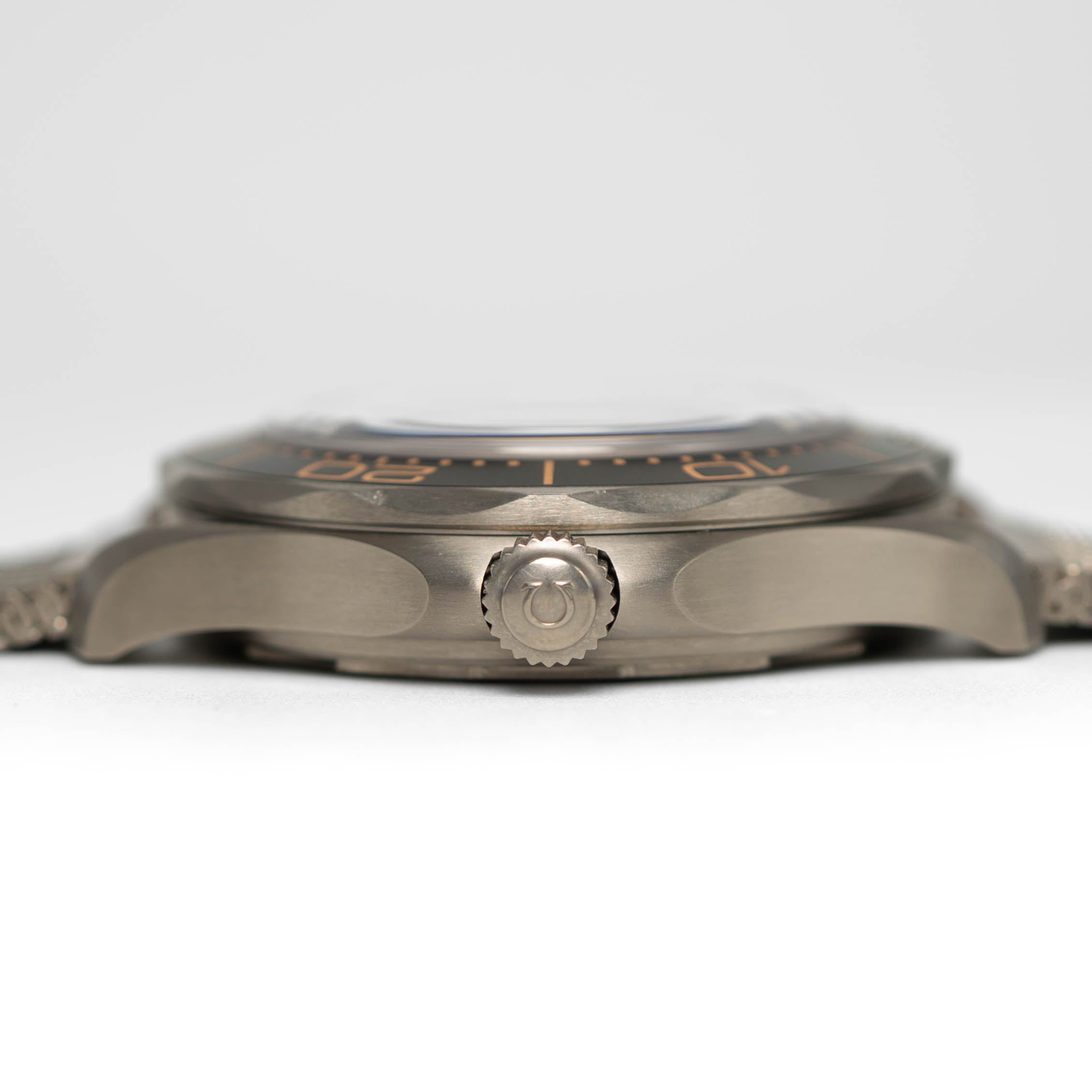 The Omega Seamaster Diver 300M 210.90.42.20.01.001, famously known as the “No Time To Die” edition, combines professional dive-watch capability with lightweight military-inspired engineering and cinematic heritage. Crafted entirely from Grade 2 titanium, the 42 mm case and mesh bracelet deliver exceptional strength while remaining noticeably lighter on the wrist than traditional steel models.