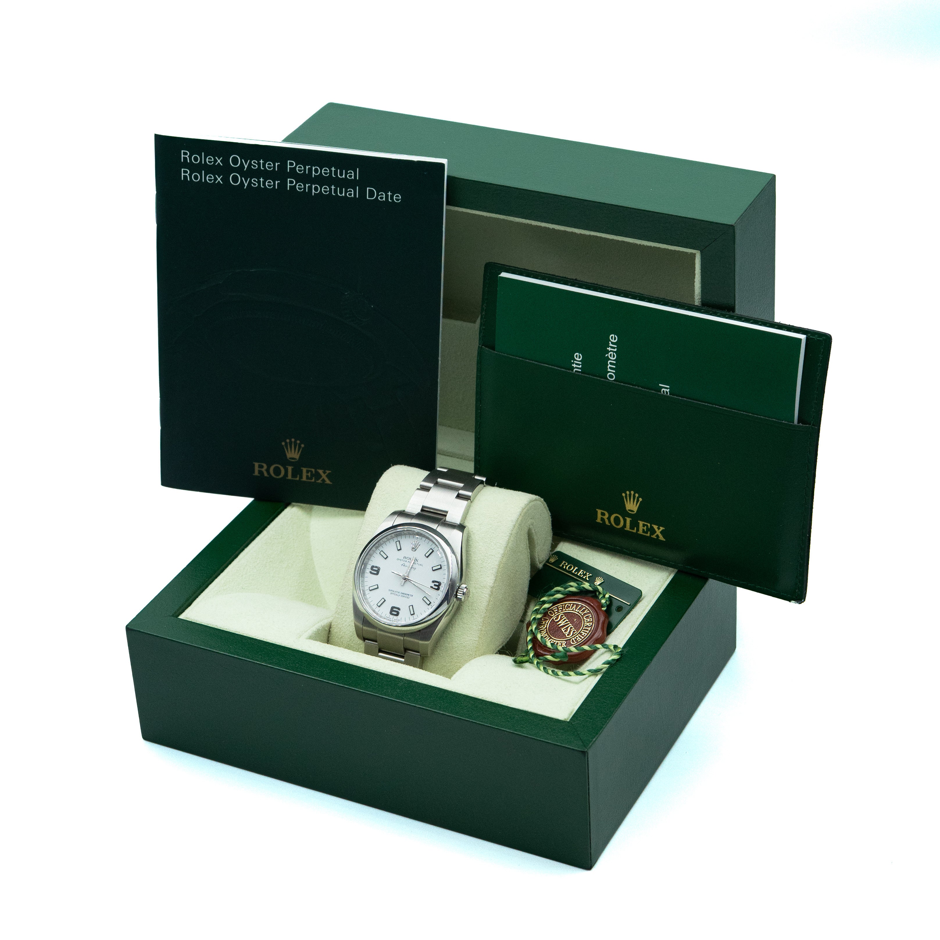 Rolex Air-King 114200 Our example is presented as a full set in stainless steel. This 2014 model represents the final modern era of the 34mm Air-King, featuring the robust Oystersteel construction and a smooth polished bezel. Accompanied with dated warranty card, booklets and original Rolex box.