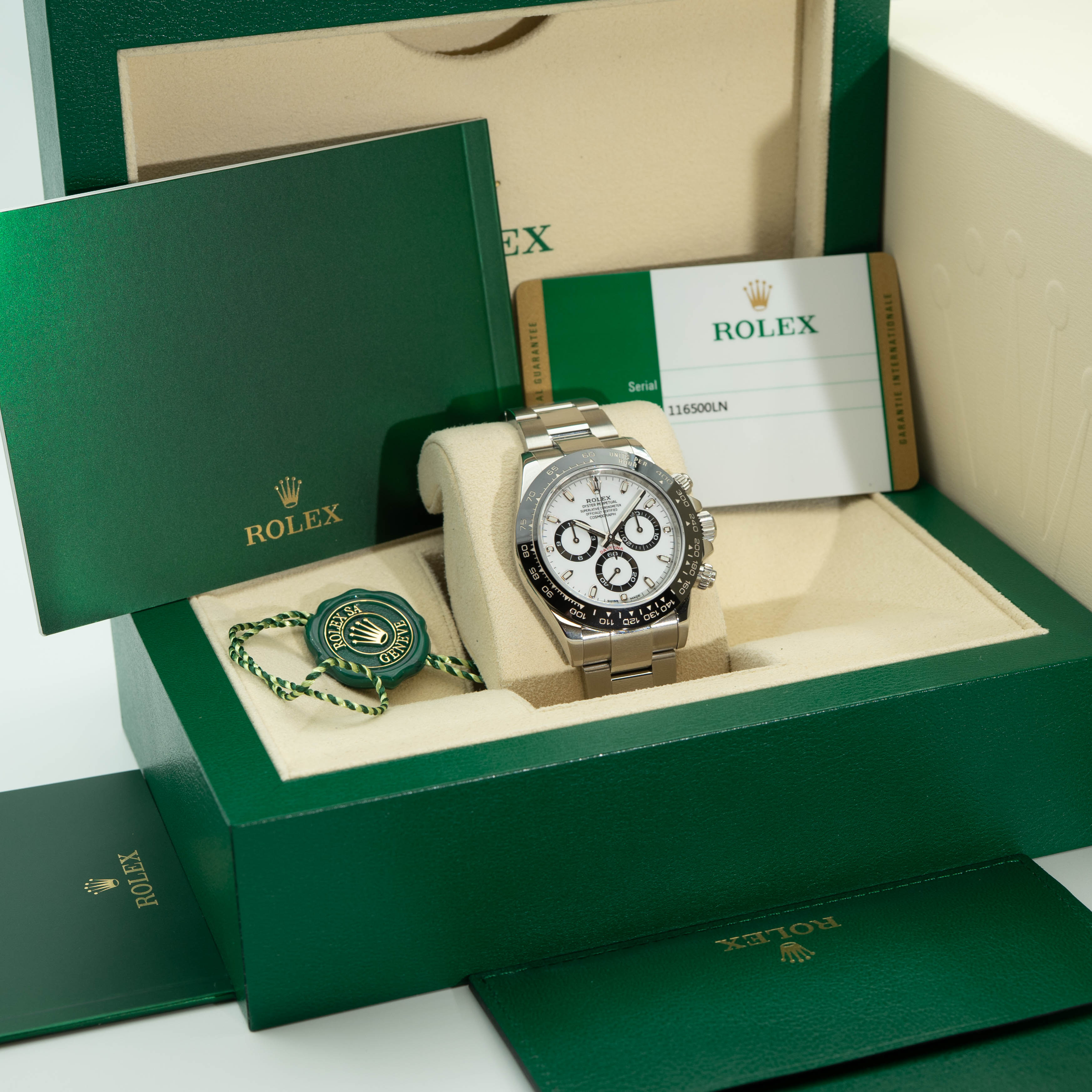 The Rolex Cosmograph Daytona reference 116500LN is one of the most iconic and collectible modern Rolex sports watches ever produced. Introduced in 2016 and discontinued in 2023, this stainless-steel Daytona marked a major milestone as the first steel Daytona fitted with Rolex’s scratch-resistant black Cerachrom ceramic bezel - instantly elevating its desirability among collectors worldwide.