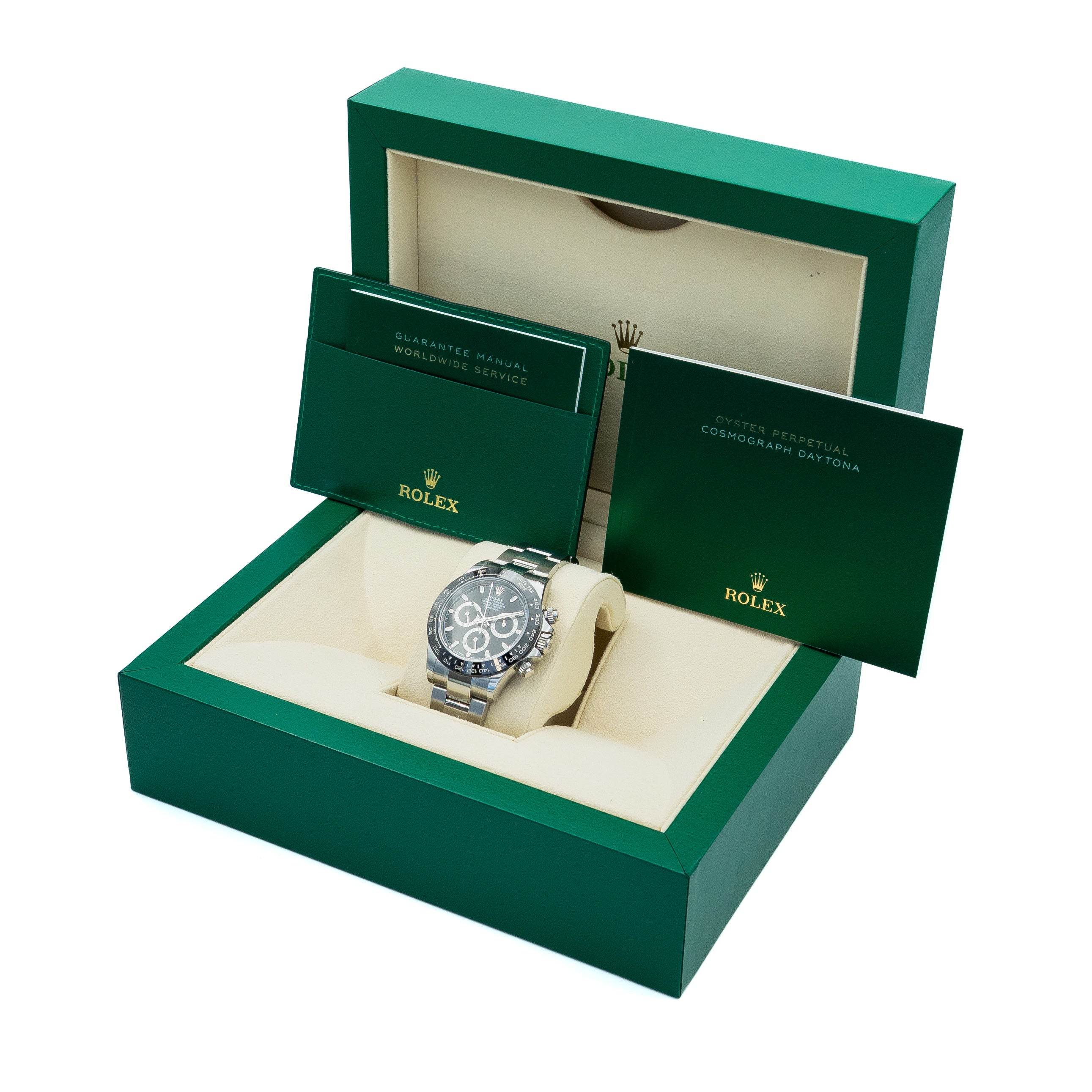 Rolex Cosmograph Daytona 116500LN, Our example is presented as a full set in stainless steel. This model features the high-contrast black dial and the scratch-resistant black Cerachrom bezel. Accompanied with the new style dated warranty card, booklets and original Rolex box.