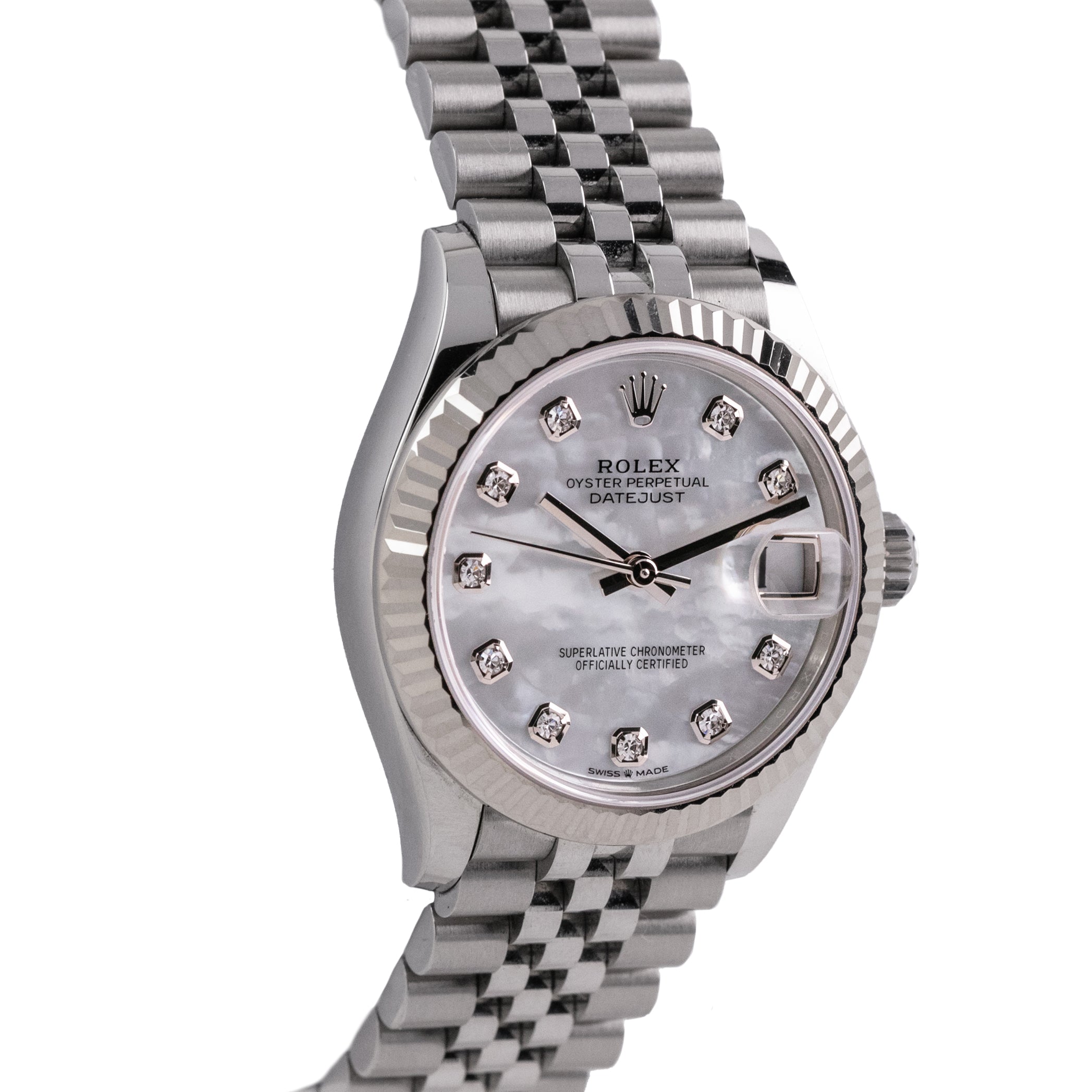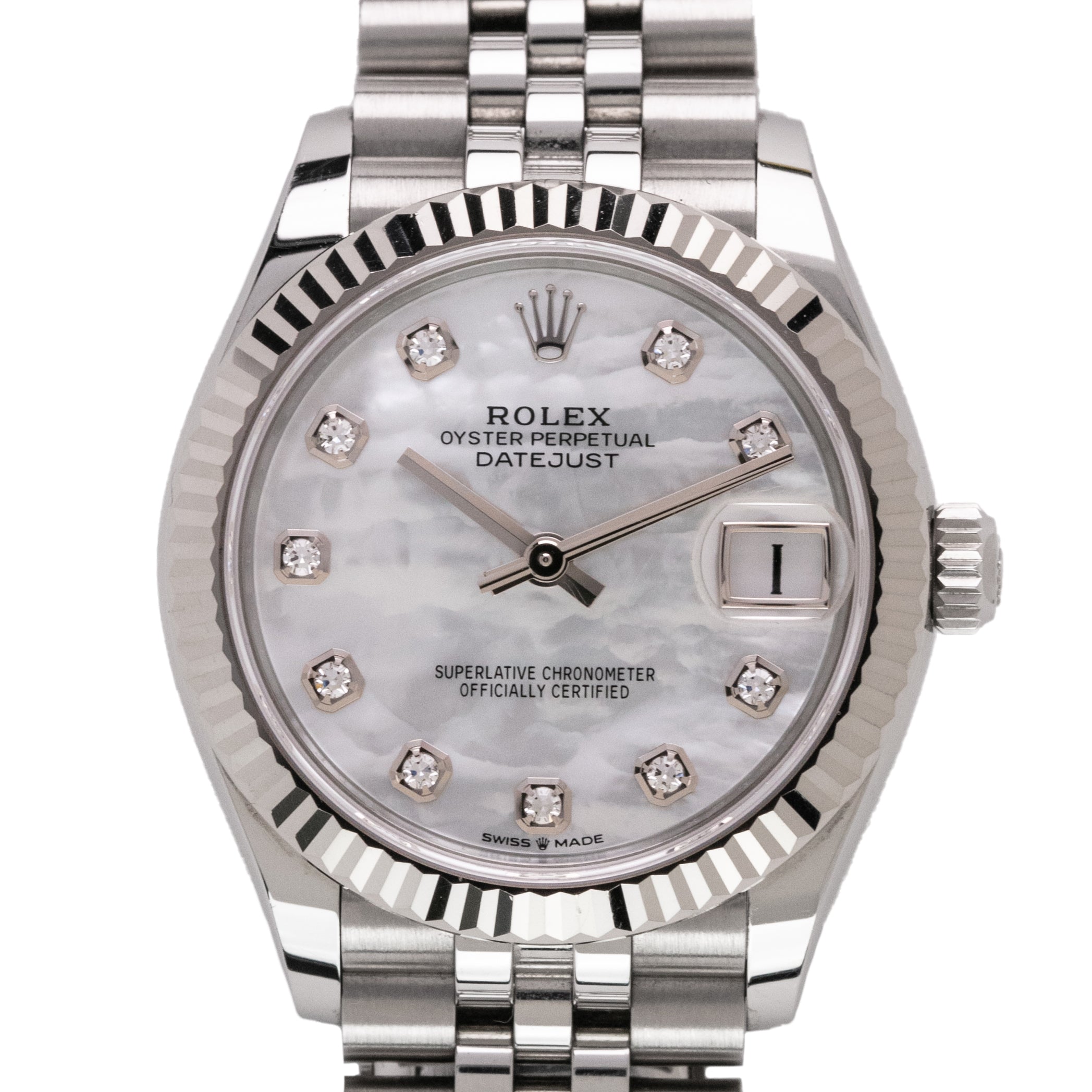 This Datejust 31 is a sublime blend of functionality and jewellry-like beauty. The Mother-of-Pearl dial, with its iridescent shimmer, ensures every watch is truly one-of-a-kind. Enhanced by diamond hour markers, the dial offers both luxury and legibility.