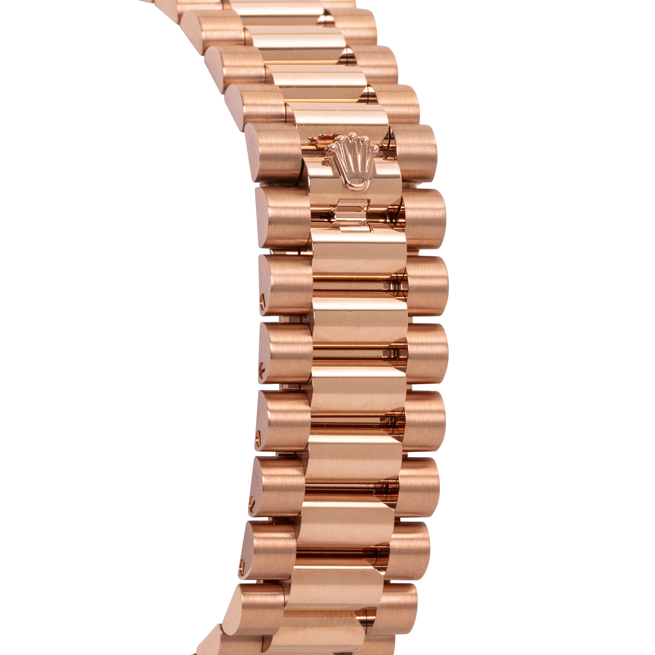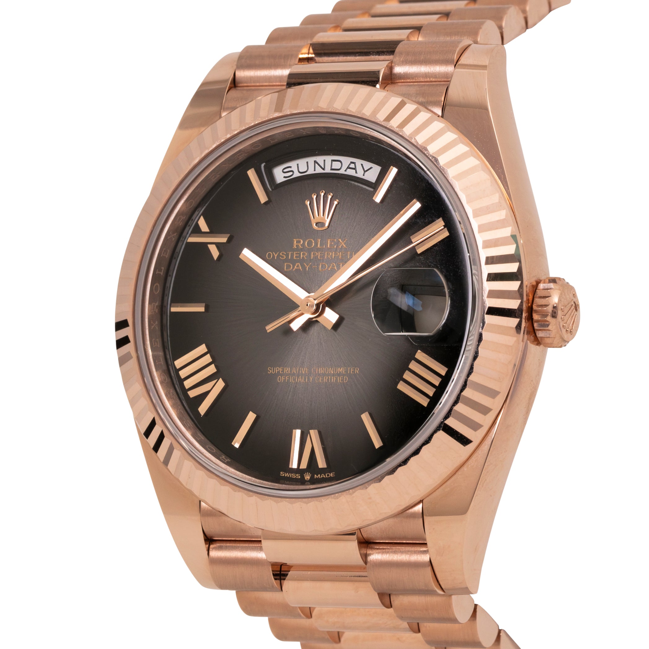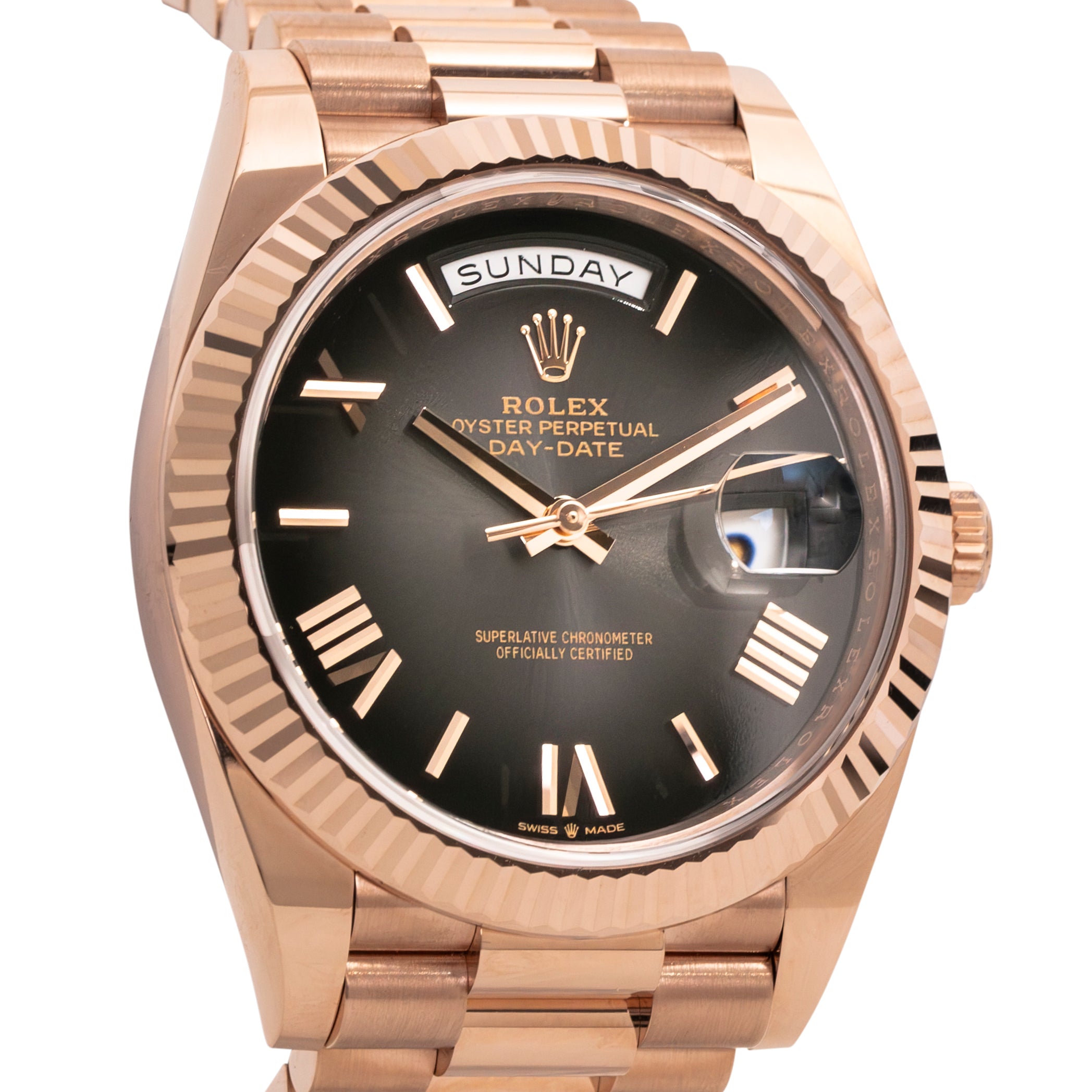 The Rolex Day-Date 40 reference 228235 is the epitome of prestige, crafted in solid 18k Everose gold and paired with a striking ombre dial that transitions seamlessly in tone, offering a unique and luxurious visual depth. Known as the “President’s Watch,” the Day-Date has been a symbol of success and refinement since 1956, and the 228235 carries that legacy into the modern era.