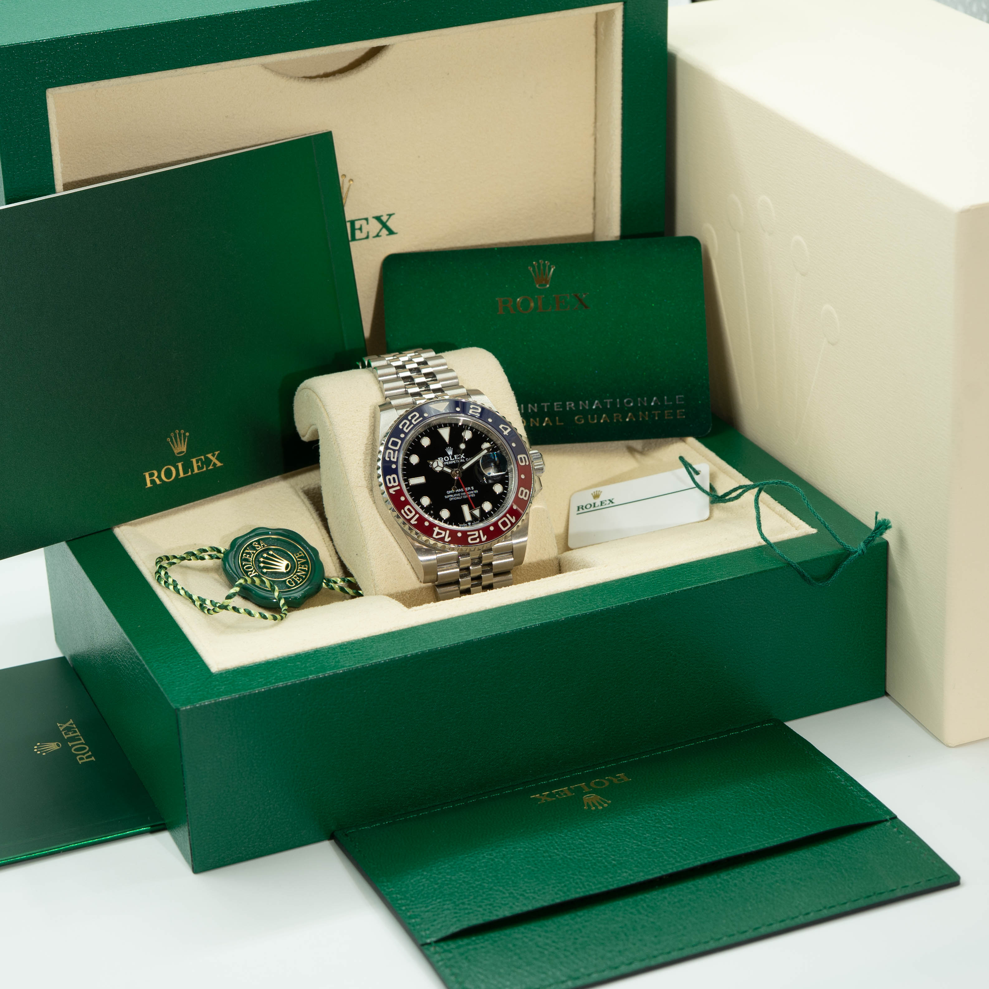 Rolex GMT-Master II 126710BLRO “Pepsi”. Our example is presented as a full set with a Jubilee bracelet. Accompanied with dated warranty card, booklets and original Rolex box.