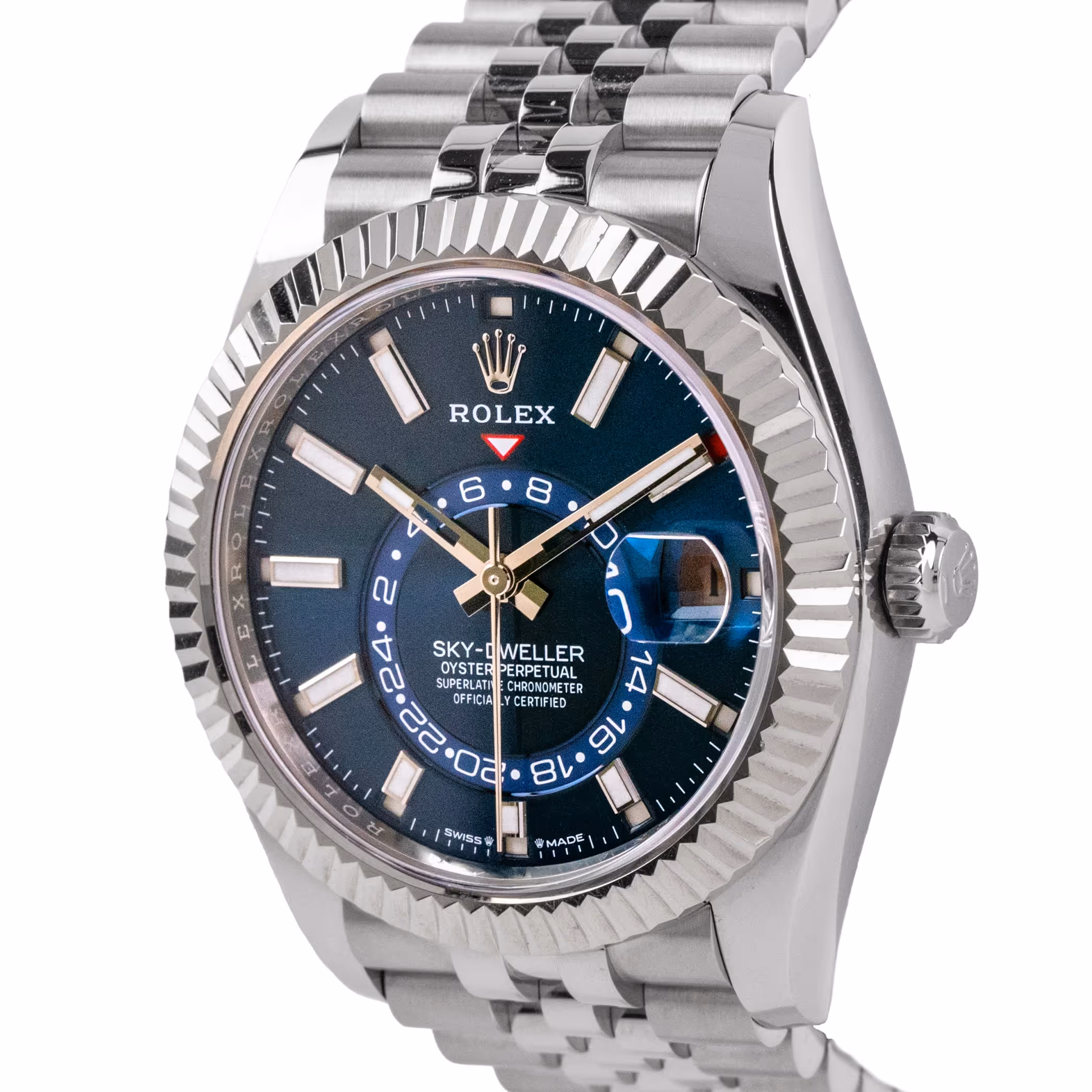 The Rolex Sky-Dweller 336934 is the ultimate blend of elegance and technical sophistication. Crafted in Oystersteel with an 18k white gold fluted bezel, this 42mm annual calendar and dual time zone complication is both bold and refined — ideal for frequent travellers and collectors alike.This updated reference features the new Caliber 9002, offering improved performance, refined ergonomics, and a 72-hour power reserve. The blue dial is both striking and functional, with the off-centre 24-hour ring, annual calendar display, and iconic rotating Ring Command bezel for intuitive setting.This piece is unworn and comes as a complete set, including original Rolex box, warranty card, manuals, and tags. Backed by Rolex’s 5-year international warranty.A modern classic with innovative functionality and timeless appeal — the Sky-Dweller 336934 is one of Rolex’s most advanced and coveted timepieces.