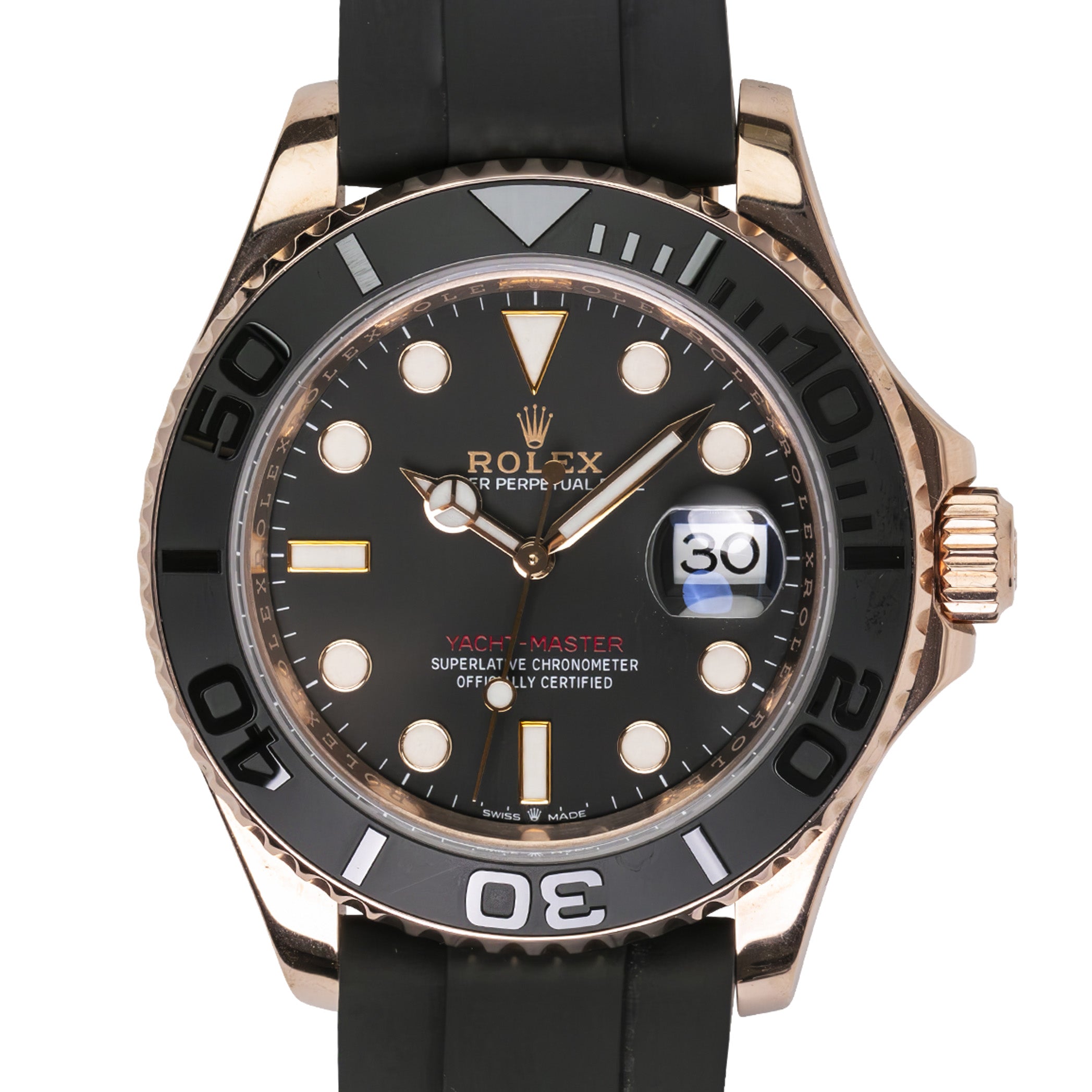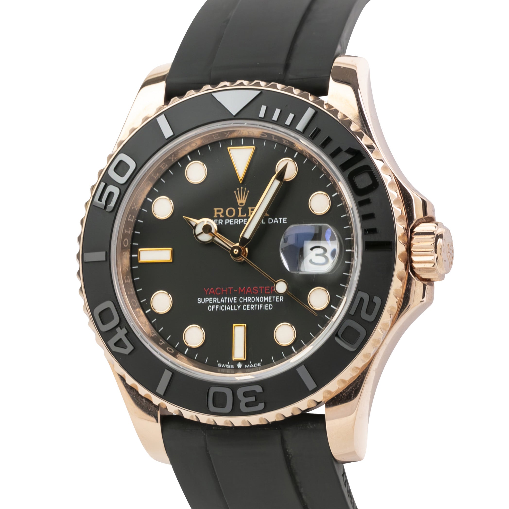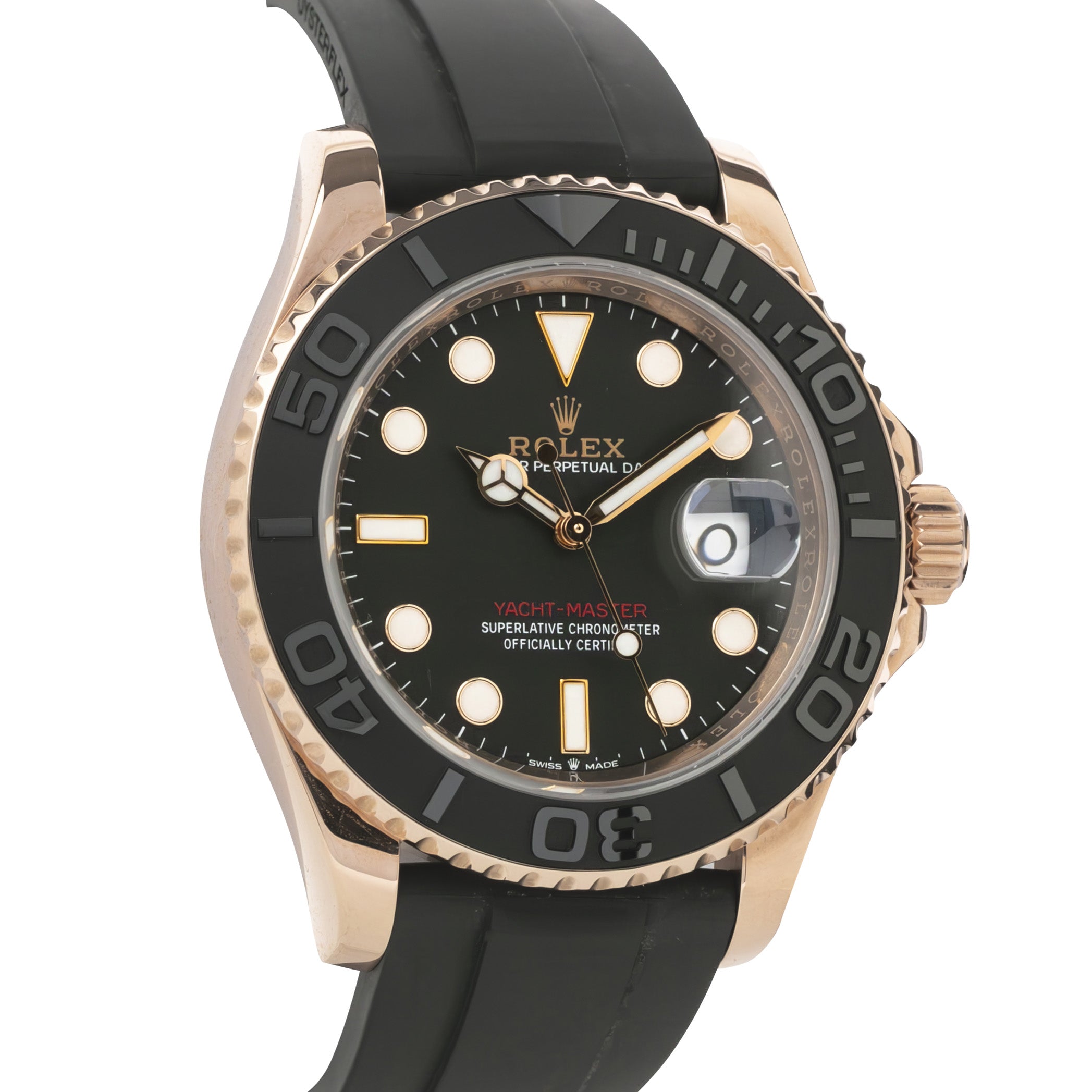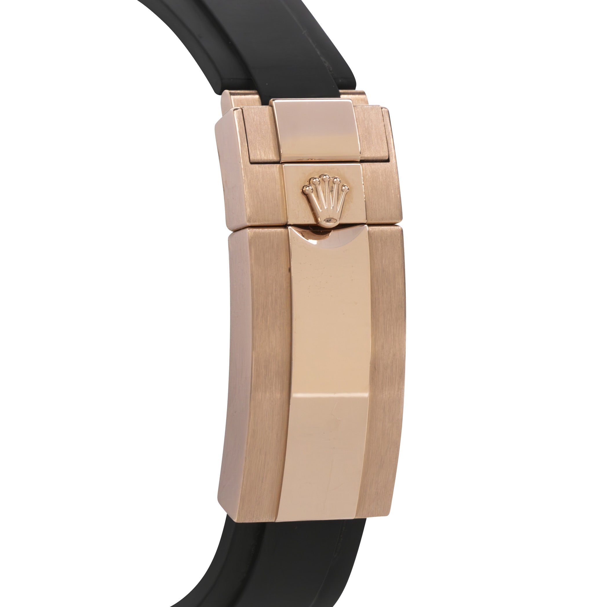 The Oysterflex bracelet—Rolex’s high-tech elastomer strap reinforced with a flexible metal blade—combines the look of a rubber strap with the feel and durability of a metal bracelet. The Everose gold Oysterlock clasp with Glidelock extension ensures a secure and customizable fit.