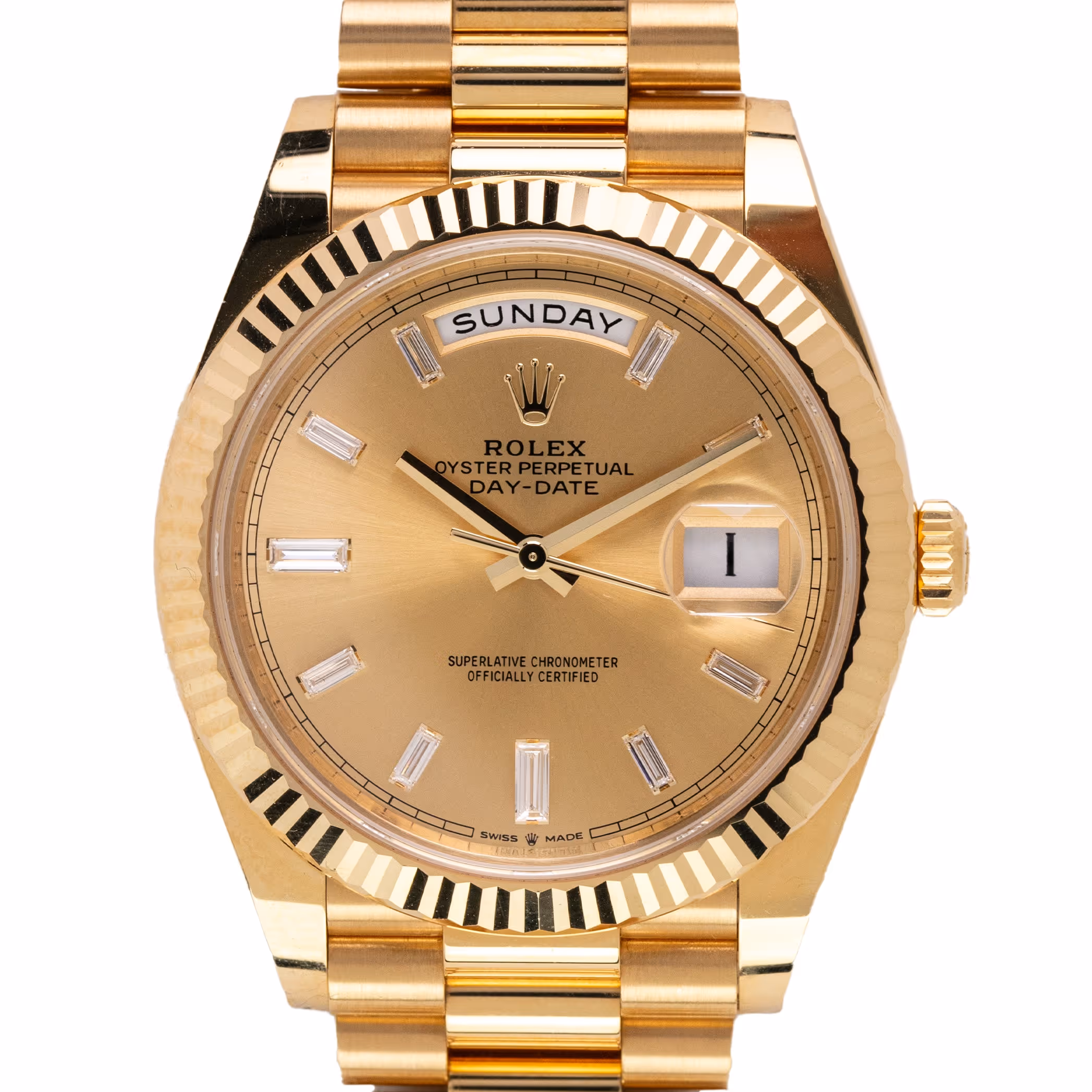 The Rolex Day-Date 40 reference 228238 is the ultimate symbol of prestige and timeless elegance. Crafted in solid 18k yellow gold, this iconic timepiece features the signature fluted bezel, a 40mm Oyster case, and Rolex’s distinguished President bracelet — designed for both comfort and status.
